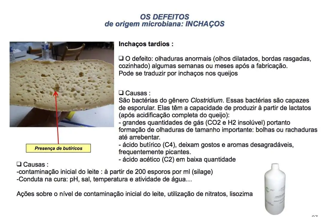 Delphine explicou que a cura do queijo começa desde a fabricação e, inclusive fatores anteriores, como a alimentação das vacas, interferem no gosto dos queijos. “O uso de silagem é algo que deve ser evitado, não somente por propiciar um gosto considerado por alguns analistas sensoriais como “desagradável”, mas também pelo risco de contaminação com bactérias que produzem ácido butírico, por exemplo o Clostridium, que se multiplica facilmente em ambientes anaeróbios como milho ou cereais fermentados” explicou a professora. Essas bactérias causam inchamento tardio e mau gosto nos queijos, mas não provocam intoxicação no ser humano (ao contrário das butíricas das latas de conserva). A solução no caso desse problema está na melhora da qualidade bacteriológica dos alimentos do rebanho e na gestão da salga.